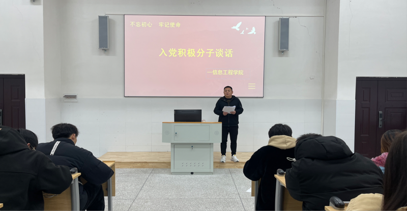 2024年1月3日晚上,信息工程学院辅导员向正老师与27位向党组织递交入党申请书的同学在敏行楼111教室举行集体谈话会,勉励他们加强学习,坚定信仰;勇于实践,争当先锋;接受考验,争取早日入党。